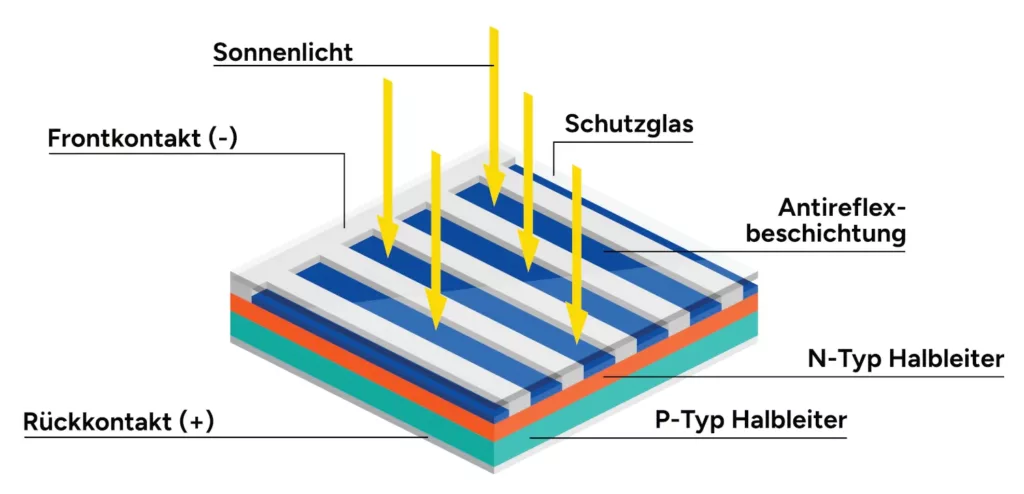 Zunächst trifft das Sonnenlicht auf das Schutzglas, das die darunterliegenden Schichten vor Umwelteinflüssen schützt. Direkt unter dem Glas befindet sich die Antireflexbeschichtung, die dazu dient, die Menge des reflektierten Lichts zu minimieren und so mehr Sonnenlicht in die Solarzelle eindringen zu lassen.